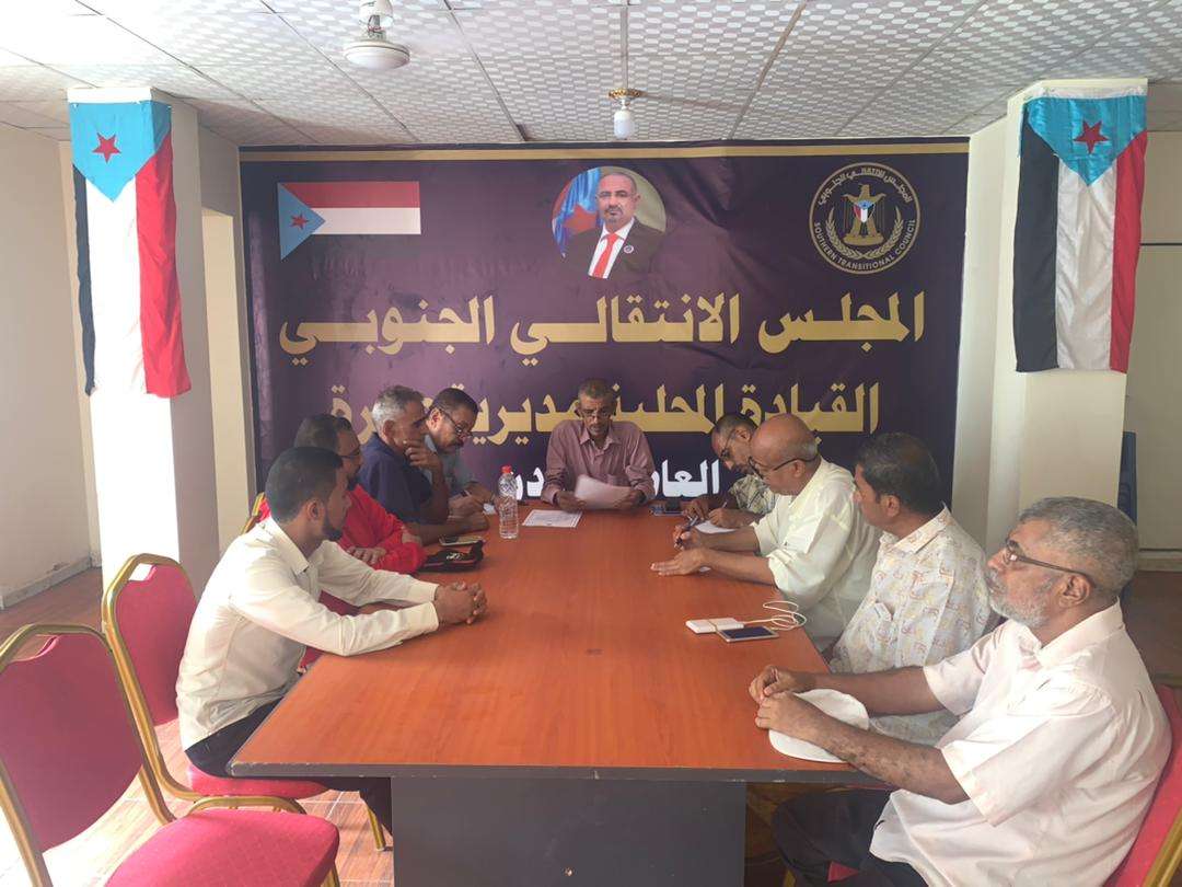 عقدت الهيئة التنفيذية للقيادة المحلية للمجلس الانتقالي الجنوبي في صيرة بالعاصمة عدن، اليوم، اجتماعها الدوري الأول لشهر أغسطس، برئاسة العقيد محمد حسين جار الله، رئيس الهئية بالمديرية.