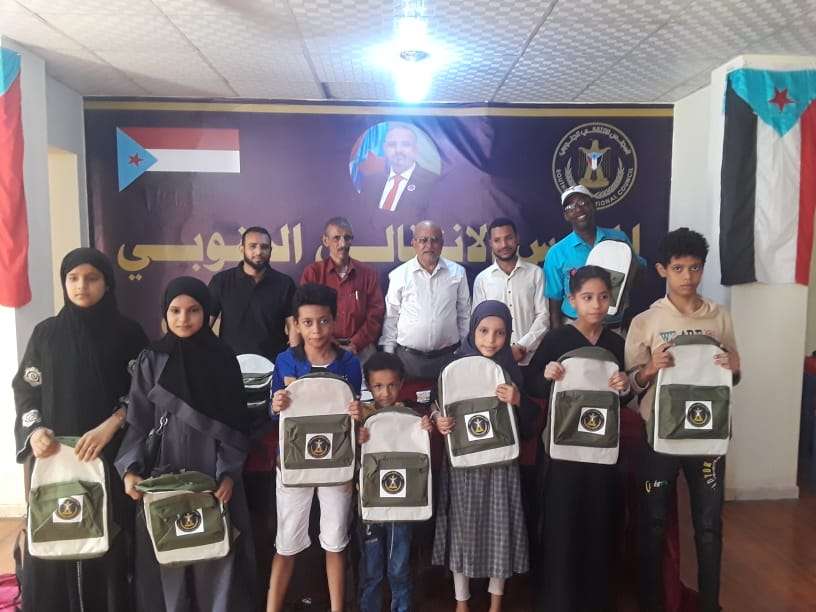 الفكر والإرشاد بانتقالي صيرة توزع حقائب مدرسية للطلبة الأشد احتياجاً في المديرية