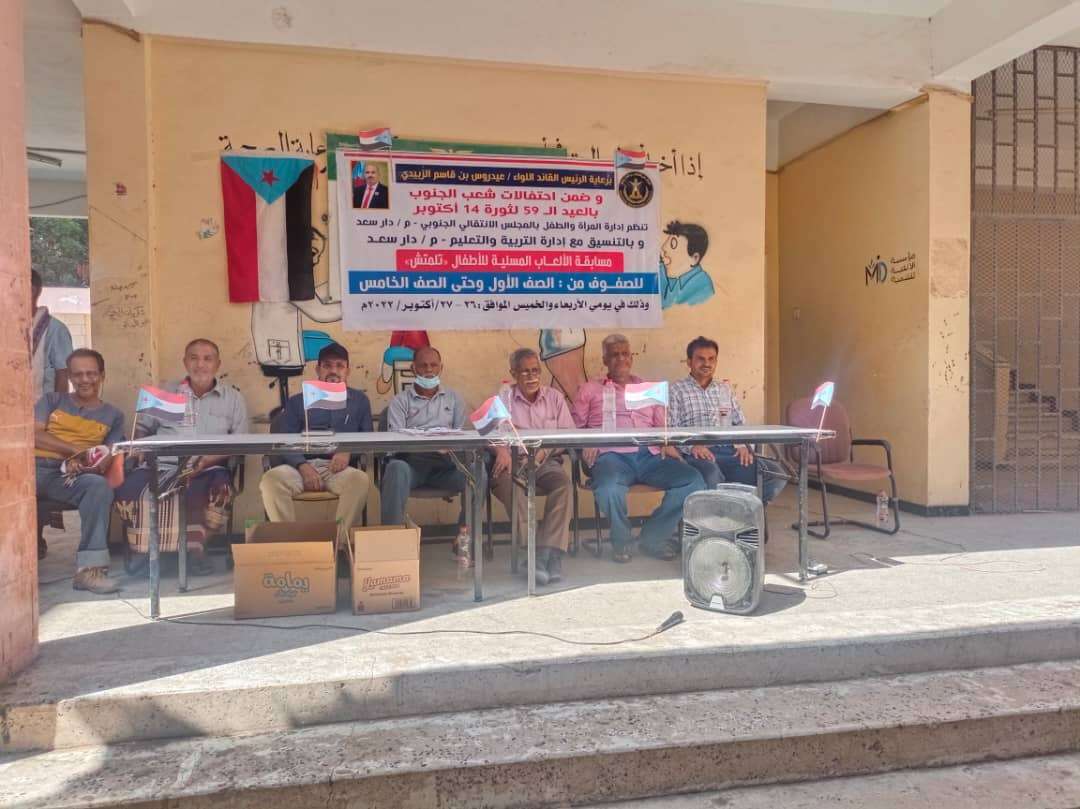 ويأتي تنظيم هذه المسابقة التي حضرها الأستاذ حسين علي عباد رئيس انتقالي دار سعد ونائبه الأستاذ وليد الجعشاني ضمن سلسة الانشطة والفعاليات التي تنفذها قيادة المجلس بمديرية دار سعد بمناسبة الذكرى 59 لثورة ال 14 من اكتوبر المجيد .