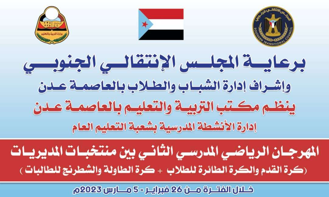 تنطلق يوم غدا الأحد فعاليات مهرجان عدن الرياضي المدرسي الثاني للعام الدراسي 2022-2023م والذي ينظمه مكتب التربية والتعليم ممثلة بإدارة الأنشطة المدرسية قسم النشاط الرياضي ، برعاية ودعم المجلس الانتقالي الجنوبي في العاصمة عدن ووتحت إشراف إدارة الشباب والطلاب.