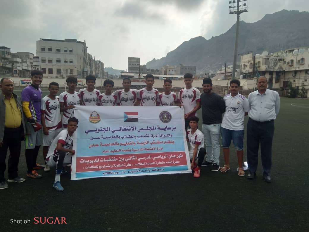 ففي نصف نهائي منافسات كرة القدم، وعلى ملعب ملعب نادي وحدة عدن الرياضي تمكن منتخب المنصورة المدرسي من الفوز على نظيره الشيخ عثمان بضربات الترجيح بـ 4 أهداف مقابل 3 بعد انتهاء وقت المباراة الأصلي بالتعادل بهدف لكلا منهما