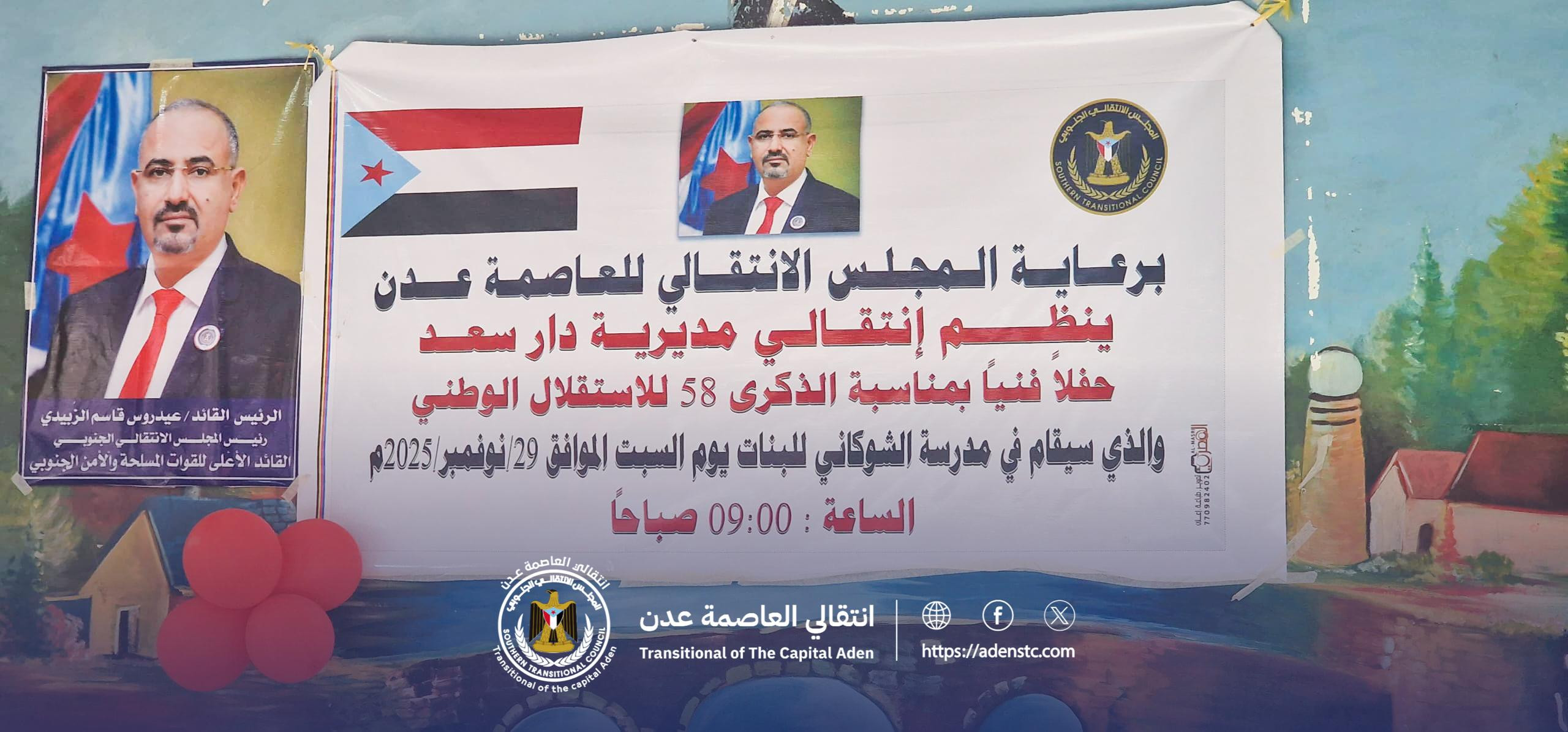 نظمت القيادة المحلية للمجلس الانتقالي الجنوبي بمديرية دار سعد في العاصمة عدن ، صباح اليوم السبت، حفلاً فنياً احتفاءً بالذكرى الـ58 للاستقلال الوطني، وذلك في مدرسة الشوكاني، وبرعاية المجلس الانتقالي الجنوبي في العاصمة عدن.