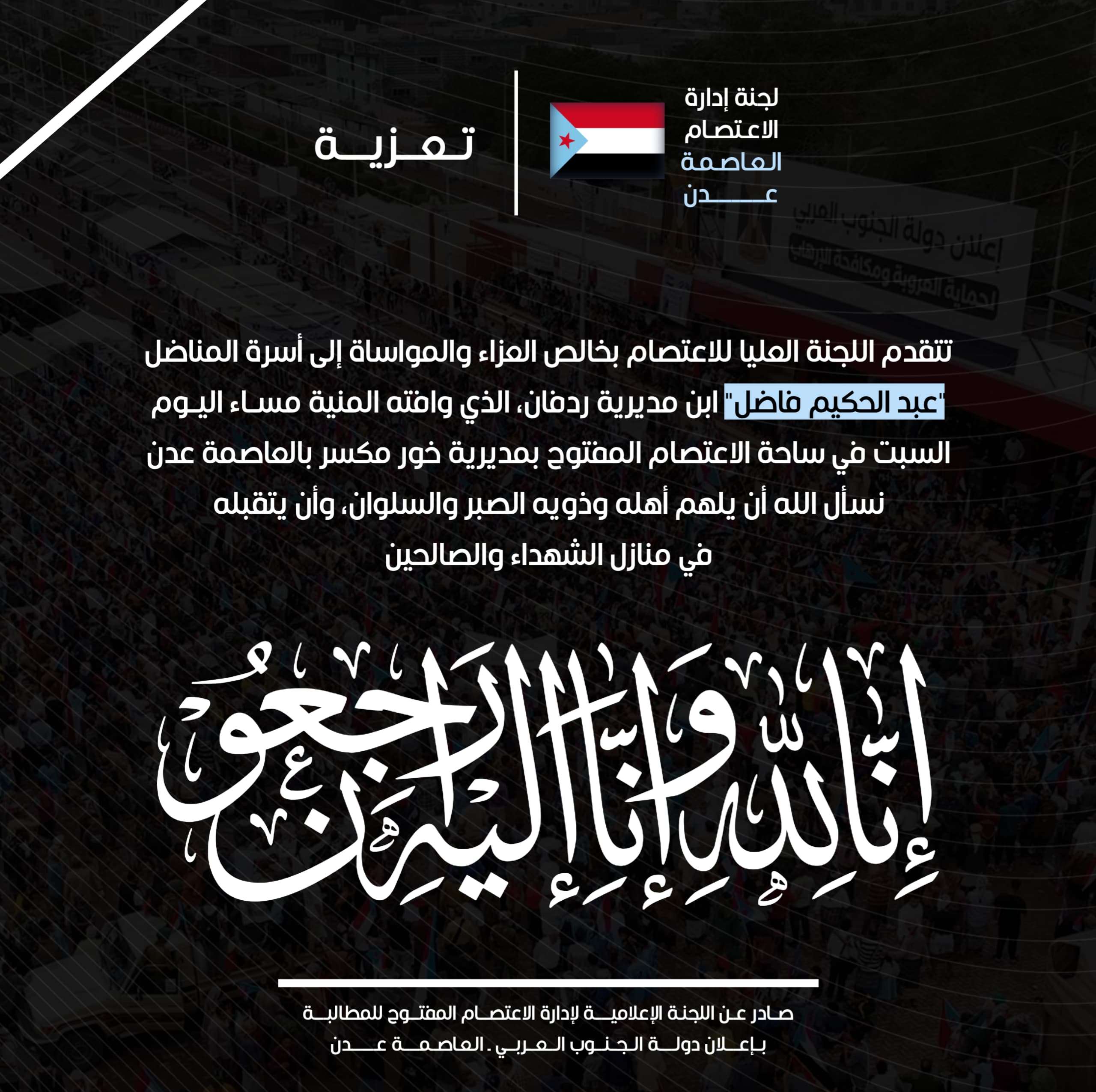 بعيون دامعة وقلوب مؤمنة بقضاء الله وقدره، تنعي اللجنة العليا للاعتصام المفتوح للمطالبة بإعلان دولة الجنوب العربي، إلى شعبنا الجنوبي وأبناء ردفان الشموخ خاصة، وفاة المناضل الجسور "عبد الحكيم فاضل"، الذي وافاه الأجل مساء اليوم السبت، في ميادين الشرف والكرامة بساحة الاعتصام المفتوح بمديرية خور مكسر بالعاصمة عدن.